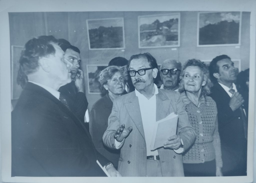 1977 рік. Відкриття персональної виставки українського радянського художника Леоніда Івановича Чернова в Старобільську. Л.І.Чернов народився 18.06.1915 в Старобільську Харківської губернії Російської імперії, почесний громадянин Старобільська. В центрі Леонід Чернов, ліворуч Іван Савич — український поет, журналіст, почесний громадянин міста Старобільська. На зворотній стороні світлини напис: «Відкриття виставки моєї в Старобільську.»